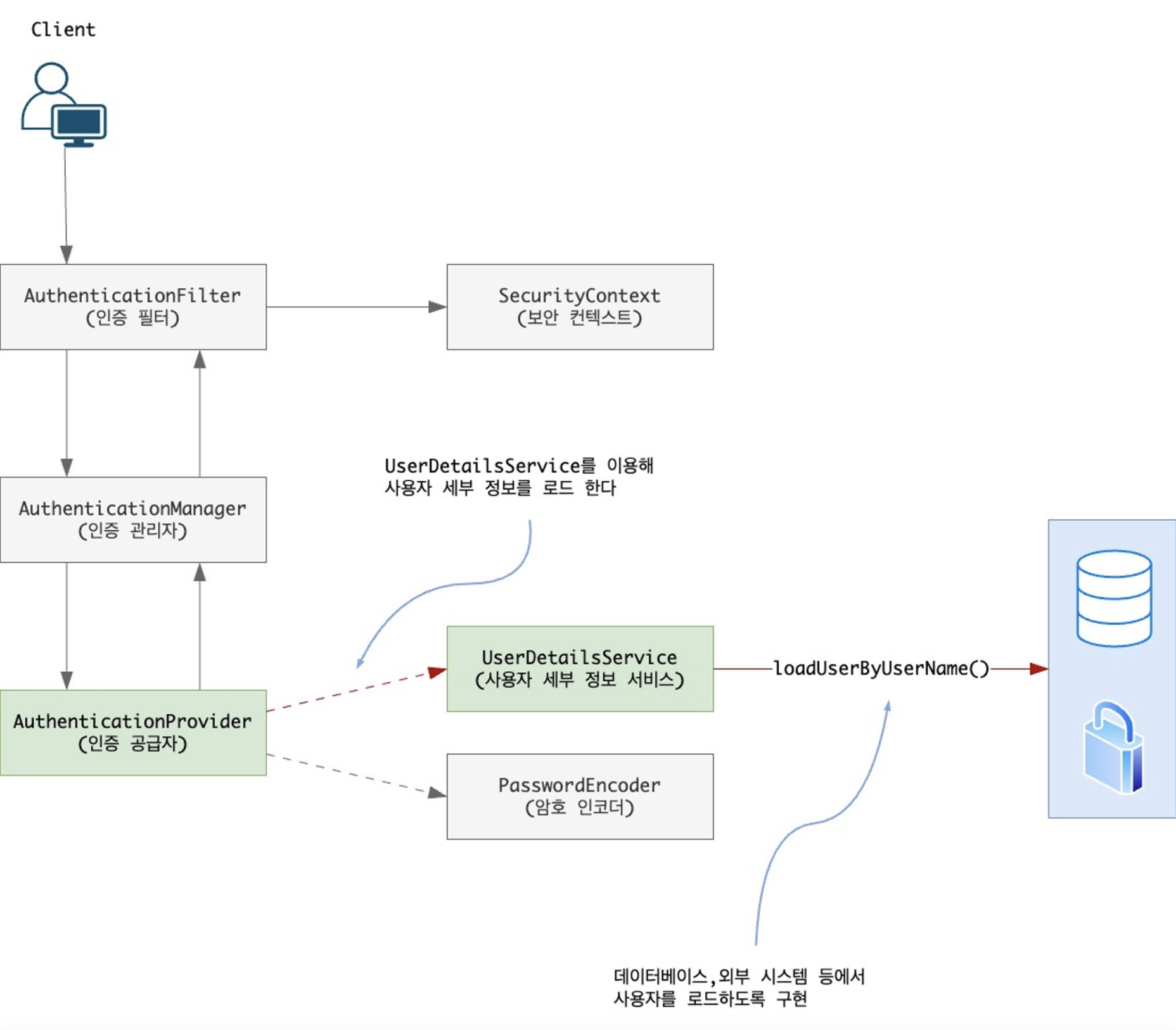 - UserDetailsService : 인증을 위해 사용자 찾음
