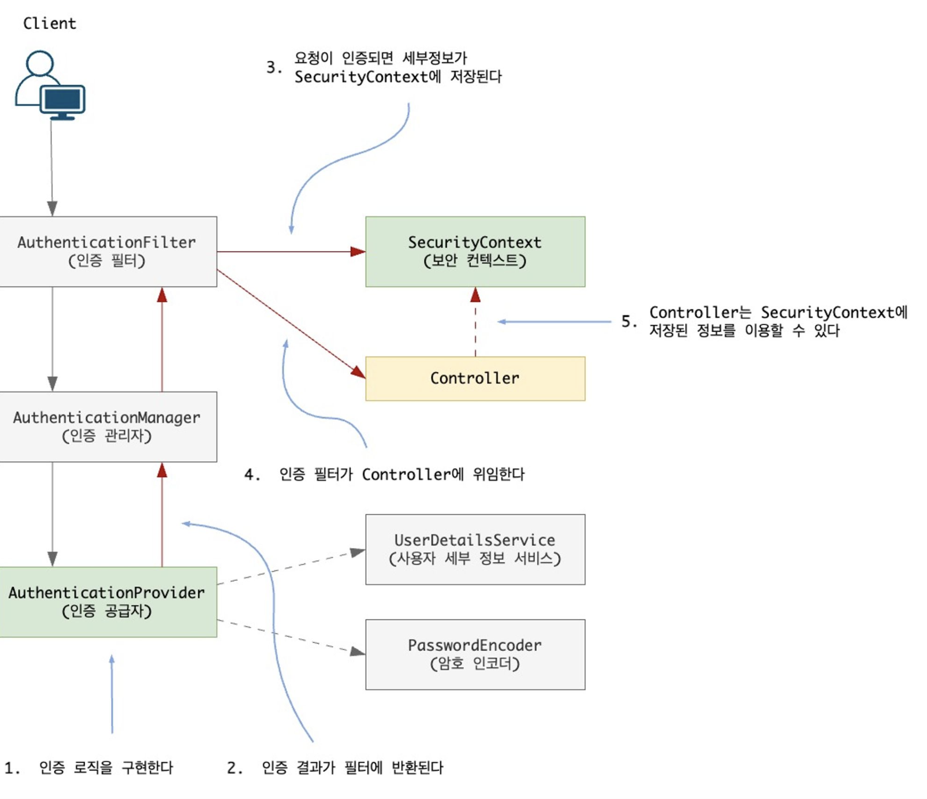 2. 인증필터 - AuthenticationManager(인증관리자) 에 책임 위임 → AuthenticationProvider(인증공급자) 에 인증 로직이 구현되어 있음 → 인증처리