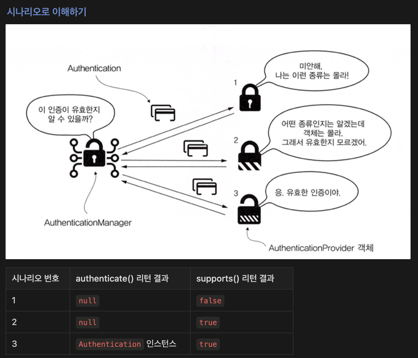 - 현재 AuthenticationProvider에서 지원되지 않는 인증객체 받으면 null을 리턴