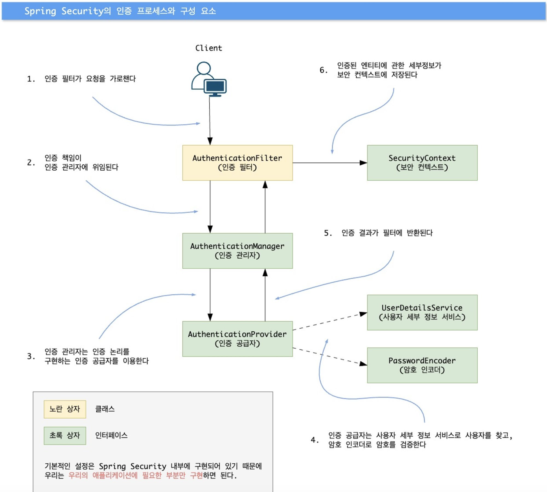 - AuthenticationProvider : 인증 로직 처리. 사용자 관리 책임은 UserDetatilsService에 위임, PasswordEncoder에 암호 검증 책임을 위임