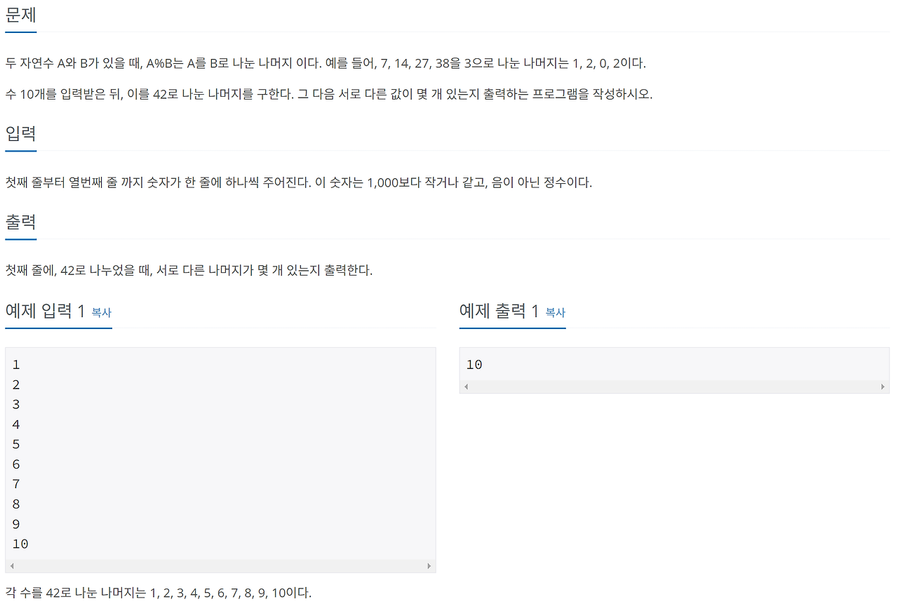 이 문제에서 서로 다른 나머지값의 수를 세면 되기 때문에,