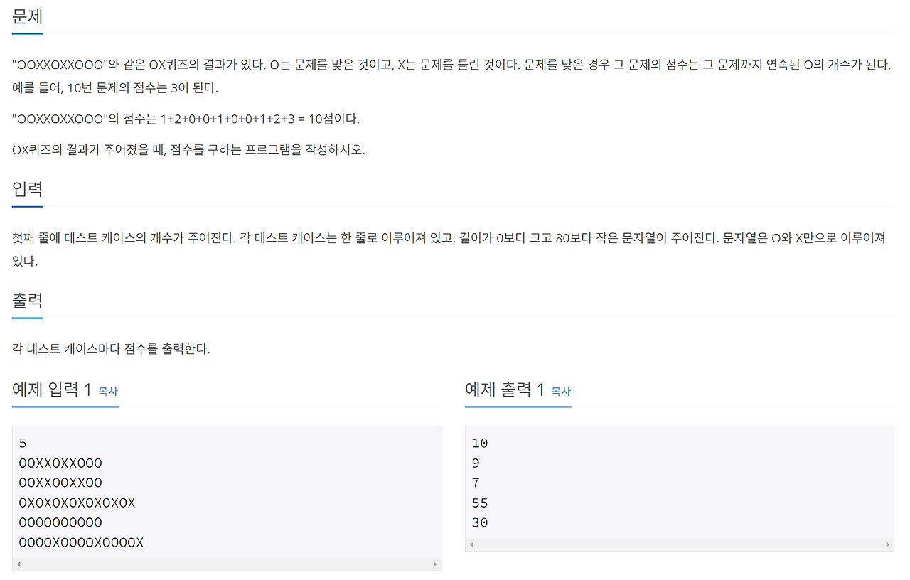 퀴즈의 ox string을 받고, cnt는 1로 초기화한다.
